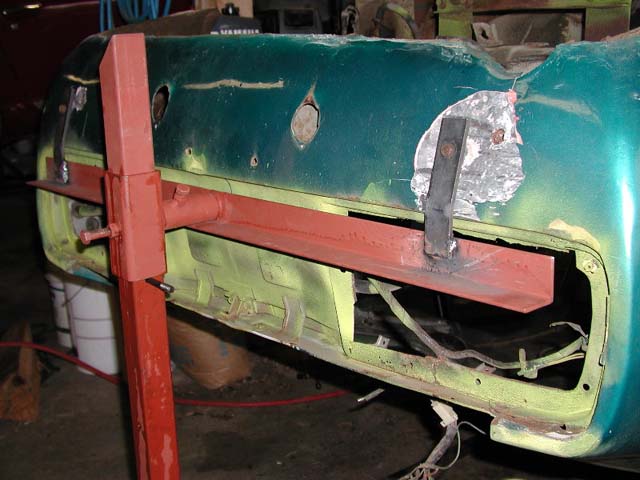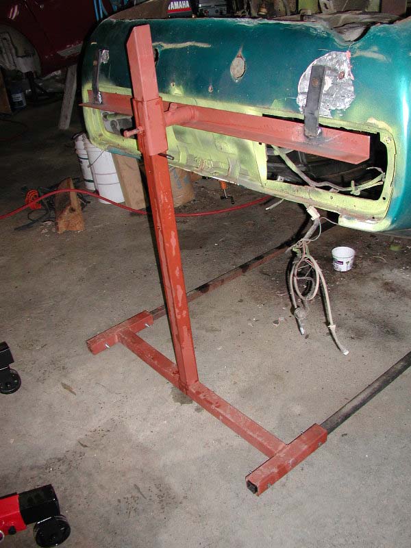 Key points to note: 5 inch offset of rotation from top bumper bolts to center of angle iron. Start with car on jack-stands and lift up with cherry picker (not by hand) and lock the