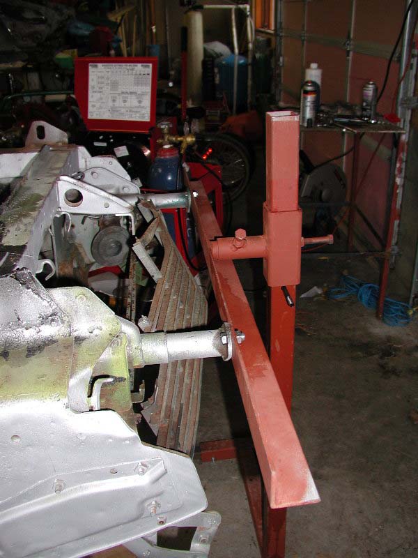 front so that it does not slide and tip forward. Then place bolt through hole drilled 36 inches off the floor. I used a head bolt. Note the center of rotation is higher than the pin by about 4 inches too. You need 32 inches to clear the floor. The tabs are bent slightly to keep the rotation parallel to the floor. Also note the bracing on the floor that connects the front and rear stands.