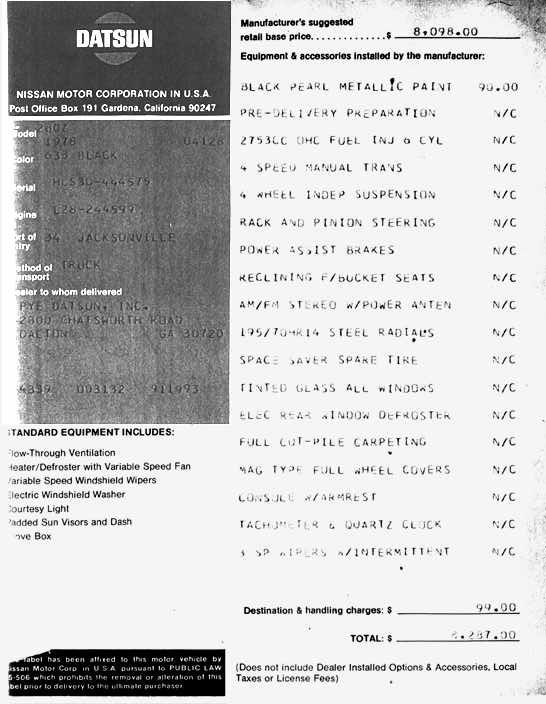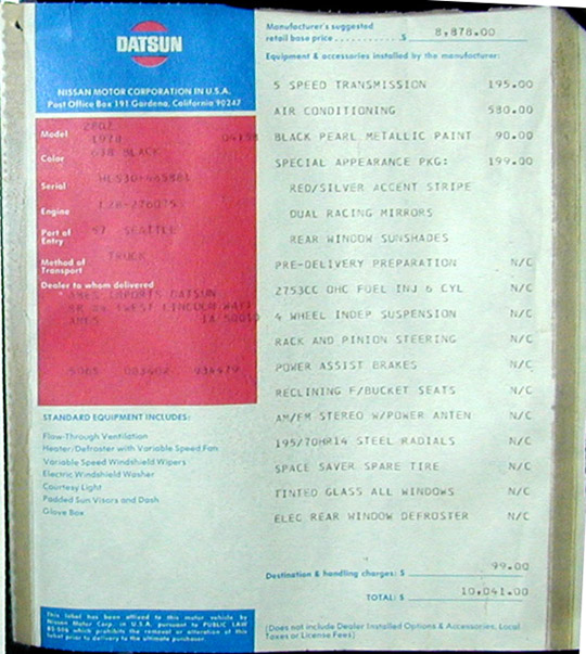 Pictured below: an original Window Sticker for the Black Pearl 280Z , Followed by an original Window Sticker showing the extra cost options a) Special Apperance Package, b)5-Speed Transmission and c)Factory Air Conditioning . {contributed by: Bryon D. Hill, Dalton, GA, and Carl Beck IZCC #260}