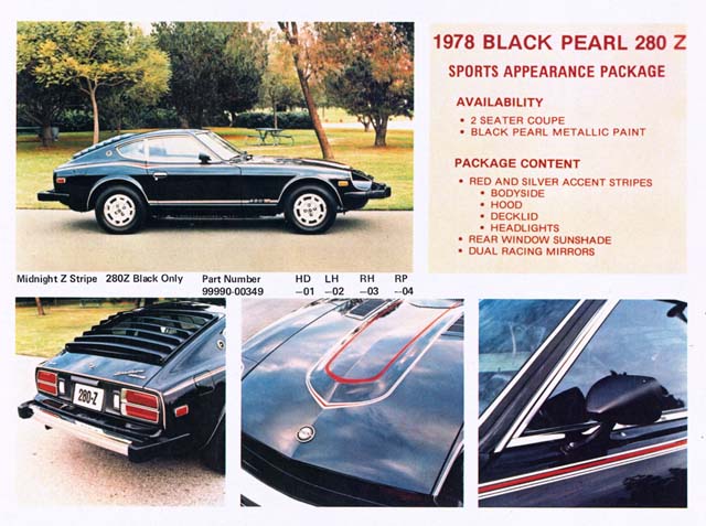 Shown in the picture below: is the "Dealer Sheet", which Nissan Motors sent to all the Datsun Dealers introducing the "Black Pearl Edition" with the "Sports Appearance Package" (SAP). Note that the original pinstipes were Red and Silver. Click On Image for full size view.