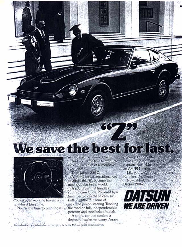 Pictured At Right: - A Nissan Ad showing the Black Pearl Edition 280Z with Sports Appearance Package. Note: Optional Aluminum Road Wheels, and see below.