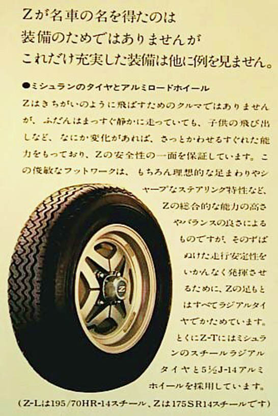Z is not the type of automobile to speed like a maniac; while it normally travels gently and straightforward, it has the ability to quickly dodge any unexpected change in a situation - for example, when a child suddenly jumps on to a street. This swift footwork, which guarantees Z's safety, is, of course, due to the excellent balance and superiority of its total facility including ideal and sharp sterling features. Yet, in order to perfectly exhibit such distinguished performance security, Z's basis is entirely guarded with radial tires. Especially, Z-T employs the Michelin steel radial tires and 5 1/2 J-14 aluminum wheel. (Z-L adopts 195/70HR-14 steel, and Z wears 175SR14 steel.)