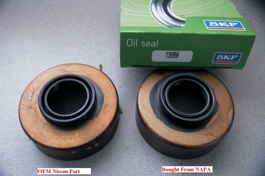 4) The SKF 13958 seal from NAPA, is the one you want!!! It is actually an identical piece to the OEM Nissan seal in every way and is made in Japan by the same manufacturer for Nissan. The bonus is you get to keep the metal collar \ dust shield and although it is a little more money it is a perfect fit.