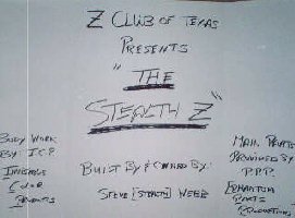 Now some long overdue "Thank You's". First, thanks to Mad Mike for putting up with Z-Cars in the back yard, in the driveway, in my bedroom, etc., and for putting up with five years worth of "Where's this Stealth Z-Car your roommate has?", questions from everyone around the country. Also thanks to my girlfriend Julie Lovelady for all the weekends she gave up (and there were a BUNCH) to be with me at my shop while I was finishing the car. And thanks to Andrew Wilhelm for my killer fender flares, and Dave Oberkriser for some excellent bodywork help. And special thanks to my very good friend (and overly trusting passenger!) Dave Olson for help sanding, painting, and 'finishing' the car; not to mention the 72 hours straight we spent getting the car ready for the Atlanta Convention immediately followed by the 16-hour drive to Atlanta.