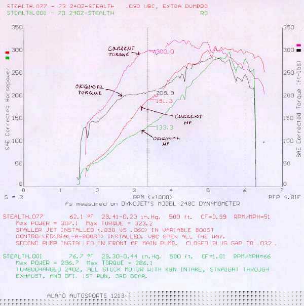 The first graph is a comparison of my very first run (basically how Iíve had the car for the last 2 years), and currently after the above tuning and a second session of dyno tuning 3 weeks later. This second session of tuning, in conjunction with the first, resulted in a dramatic increase in torque and horsepower starting at 1600 rpm and peaking at a 91 ft/lb and 58 HP gain at 3600 rpm! This was accomplished by raising the boost with a VBC (variable boost controller, which is a bleed type boost control), to 7 psi initial and boost creeping to 12 psi by 4800 rpm. A fair amount of DFI experimentation went into this as well. Working from this info, I definitely plan to invest in a Profect electronic boost controller as soon as the x-mas season is over, and quit messing around with the VBC. The top end fuel starvation was finally fixed by putting another FI pump (an extra 280ZX pump) in series with my high pressure pump. This was not my original intention, as I still plan to install my beloved ësurge tankí when time permits.