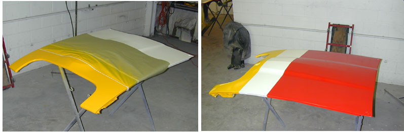 Above: Fenders masked off, yellow applied, then re-masked and the red applied.