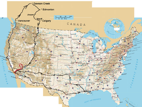 Mr. Hitoshi Uemura, Mr. Eiji Osawa and the road test team made two major loops with the Production Prototype 240-Z's though America, accompanied by a Red Datsun 510 used as the chase car. Leaving L.A. they traveled East to New Orleans, then West back to L.A.. On their second loop for cold weather testing, they traveled North from L.A. to Dawson Creek, Canada then returned South through Calgary, Canada and back into the U.S. toward L.A. again. They also made a more minor loop from L.A. though Death Valley and back to L.A. for Hot Weather Testing (see red loop on Map Above). In all some 14,000 hard miles were spent wringing out the test cars.